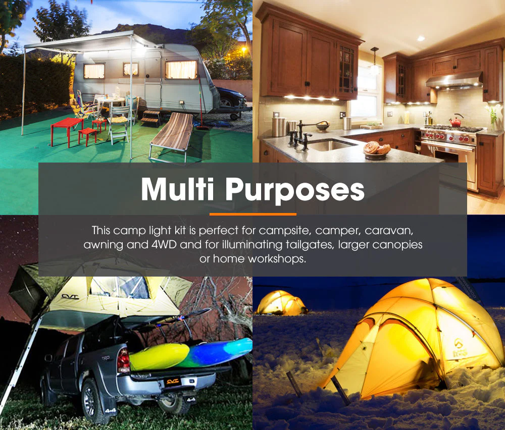 - This 2V LED Strip Light Bar Waterproof camp light kit serves a variety of purposes, including lighting up tailgates, bigger canopies, or home workshops in addition to a campsite, camper, caravan, awning, or 4WD.